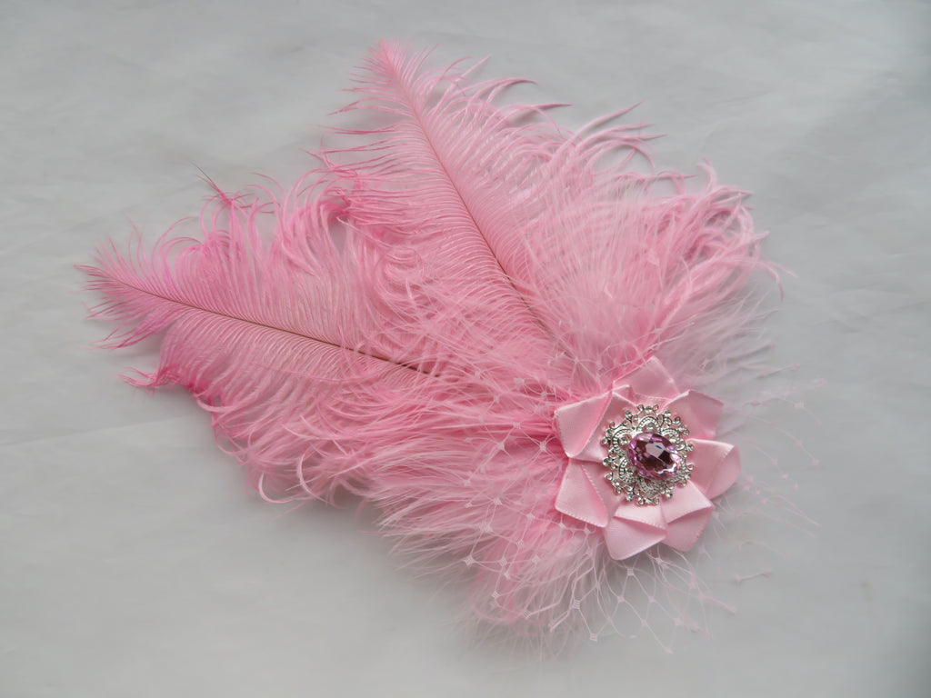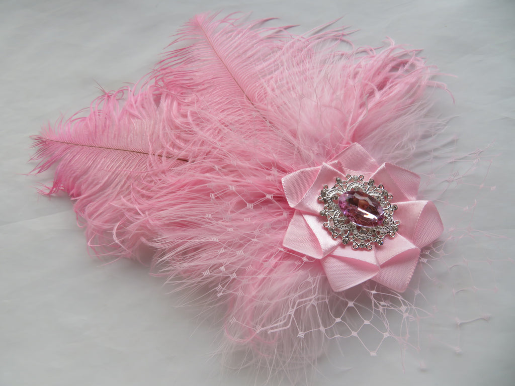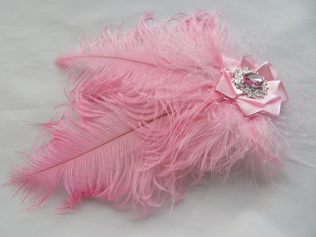 This feminine piece is crafted with curled pale candy pink ostrich feathers, complemented by downy pale pink fluff feathers for gentle volume and movement.