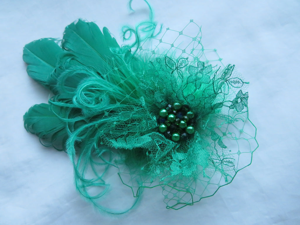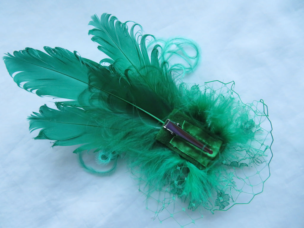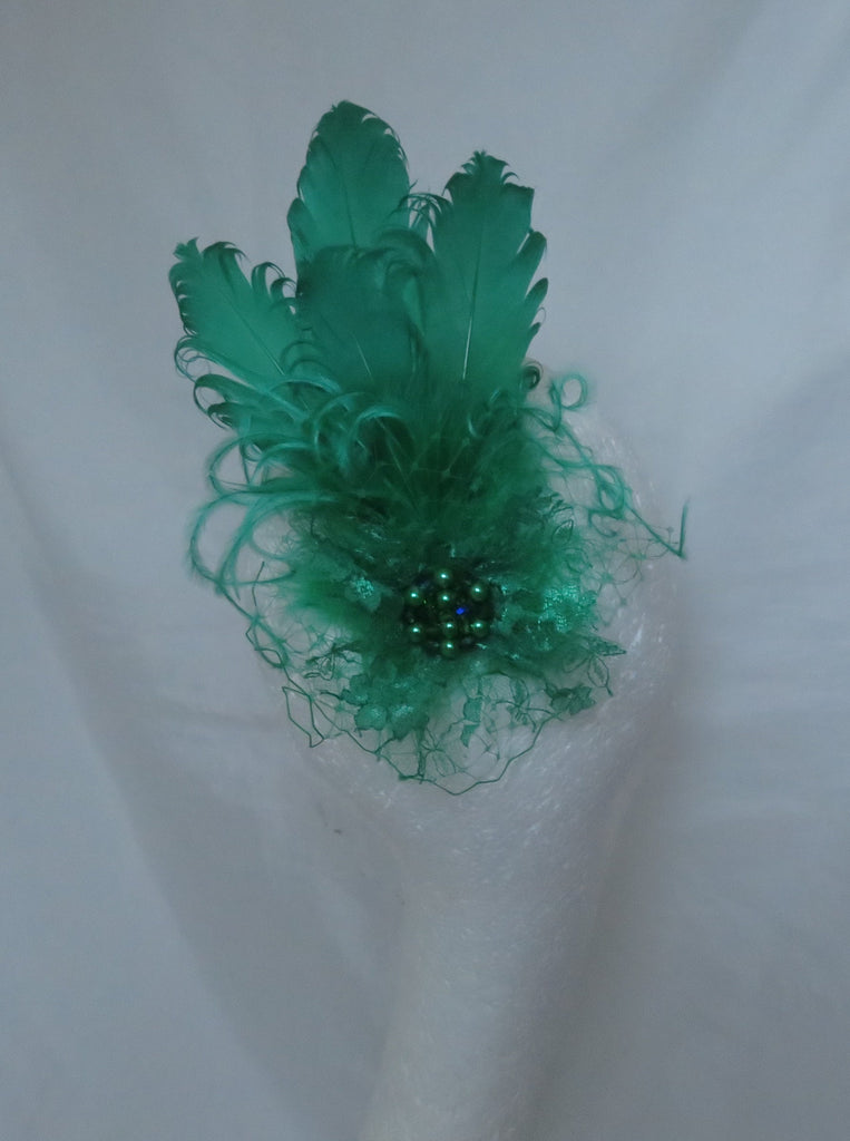 Created with emerald green rigid curled goose feathers with fluff feathers and curled ostrich fronds to soften, a puff of emerald net veiling and a ruffle of emerald green lace fabric and finished with a cluster of emerald AB and tiny peridot glass crystals and emerald green pearls.
