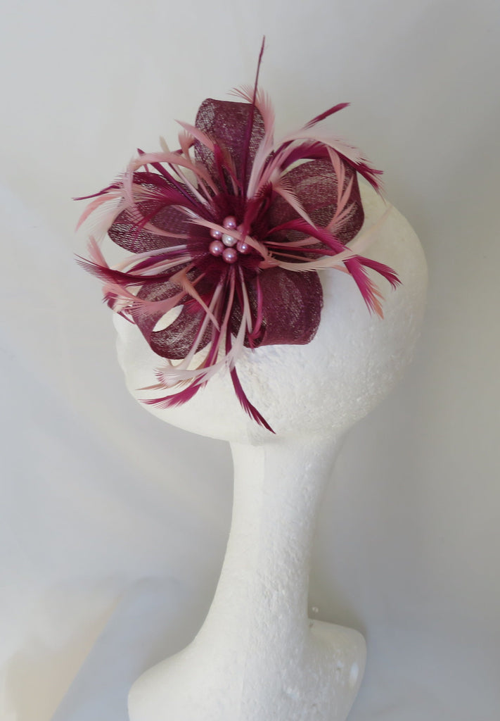 Complemented with light burgundy plum, dusky pink and a touch of pale pink biot feathers and finished with a plum burgundy tulle ruffle, and a cluster of dusky rose pink burgundy pearls and a pale pink one in the centre.