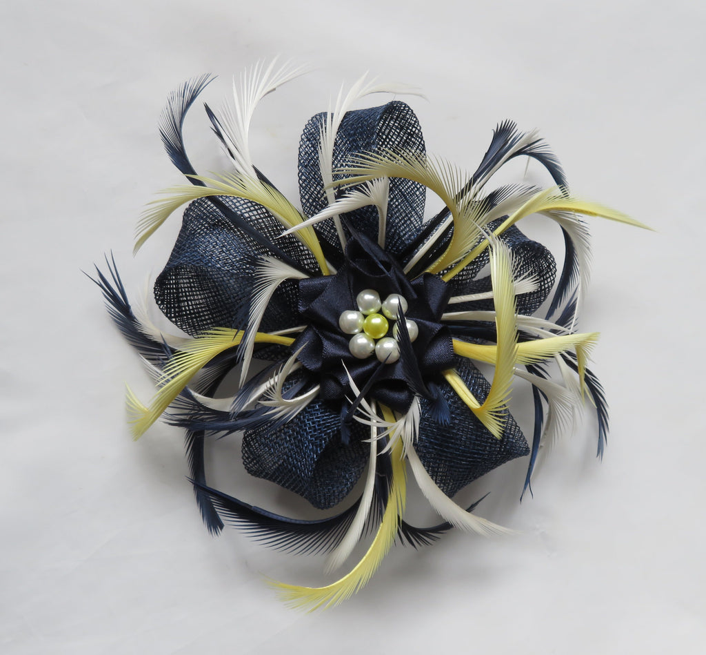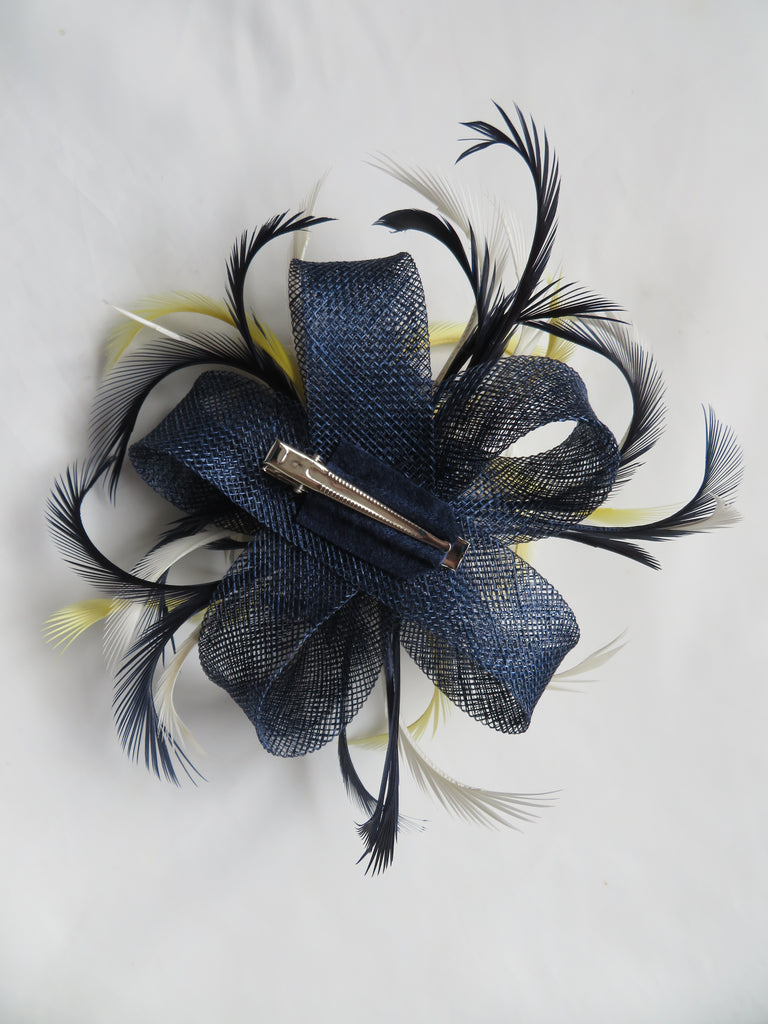 This is an attractive and eye catching sinamay loop fascinator in navy blue, ivory and primrose yellow.