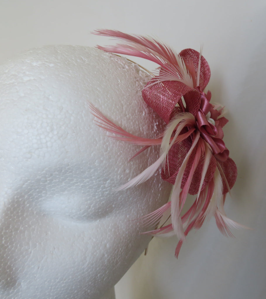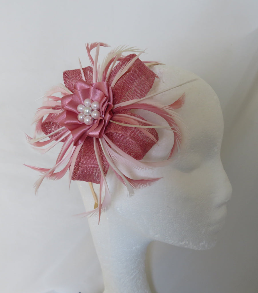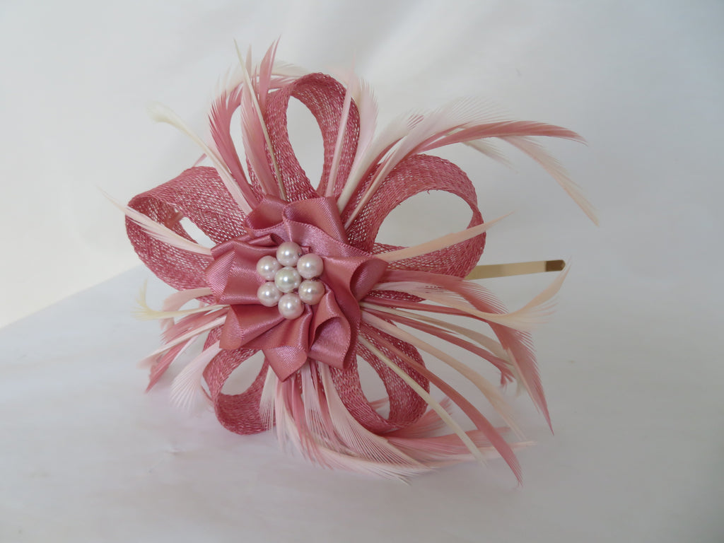 This is an attractive and eye catching sinamay loop fascinator in shades of dusky rose, pale pink and ivory.