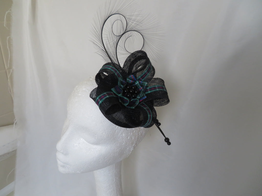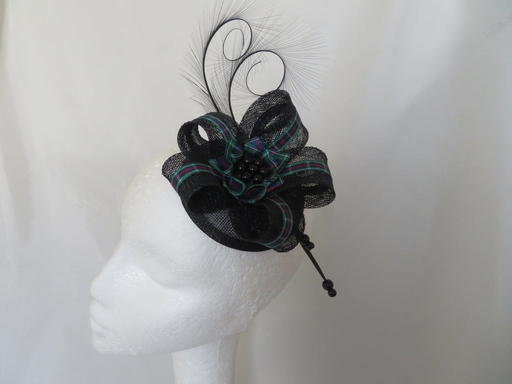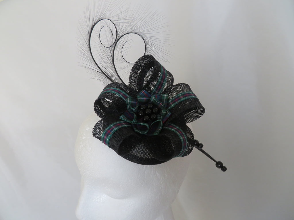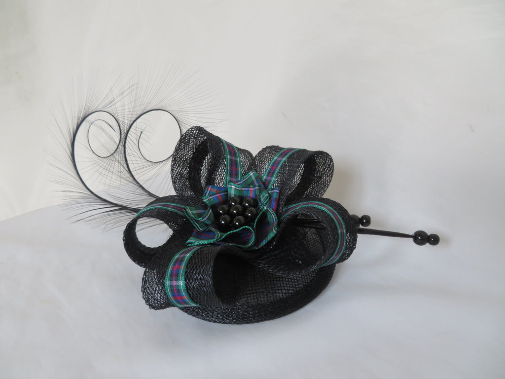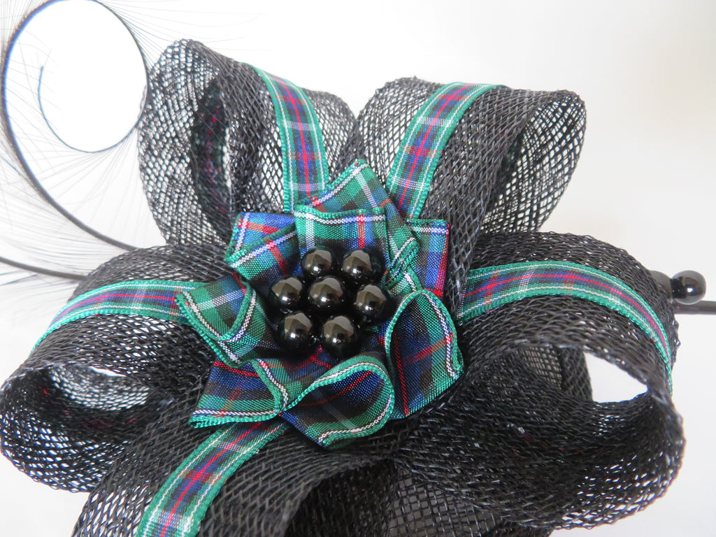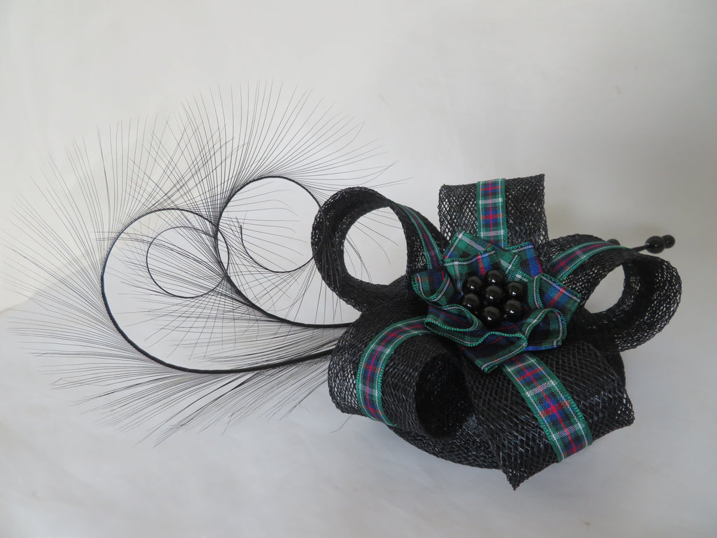 Created with two black burnt pheasant curl feathers with matching pearls pinned in the ends, a bow loop of black sinamay bias binding with a stripe of MacKenzie tartan ribbon as a highlight, a MacKenzie tartan ribbon ruffle and finished with a cluster of pearls in a highlight colour from the tartan, dark green or black.