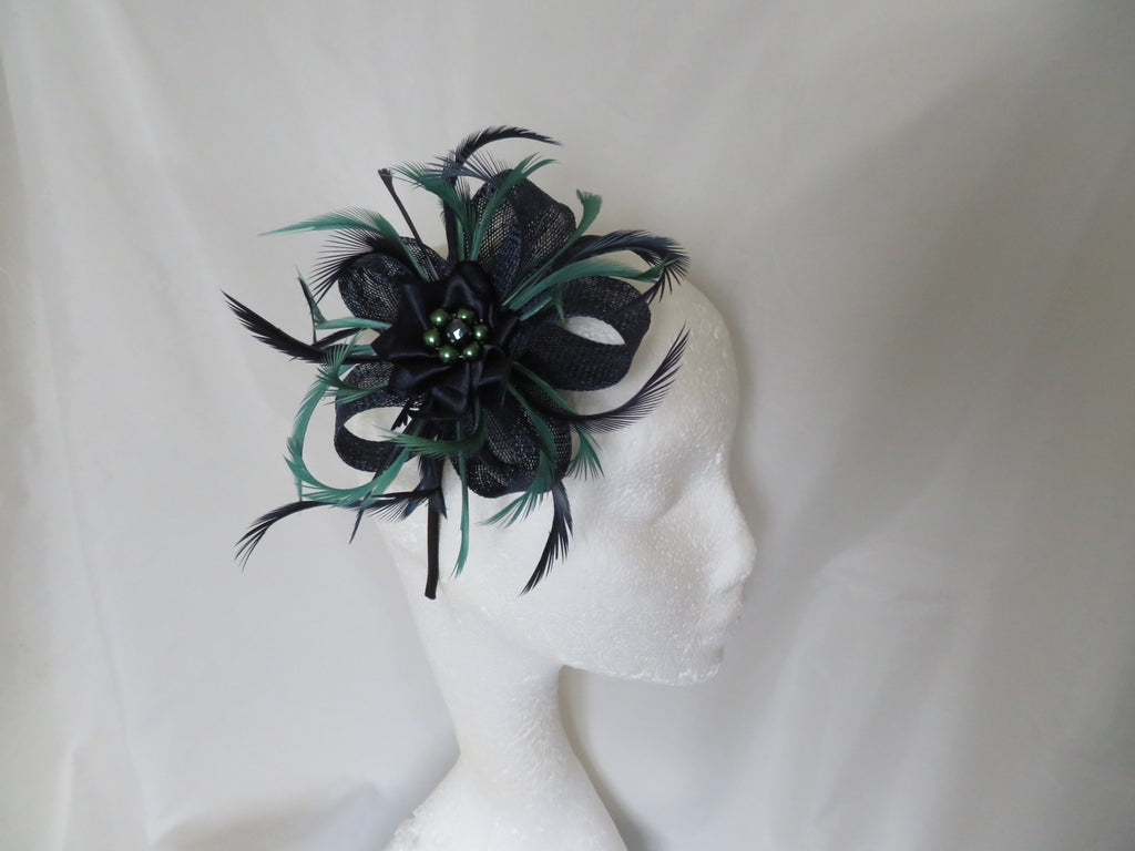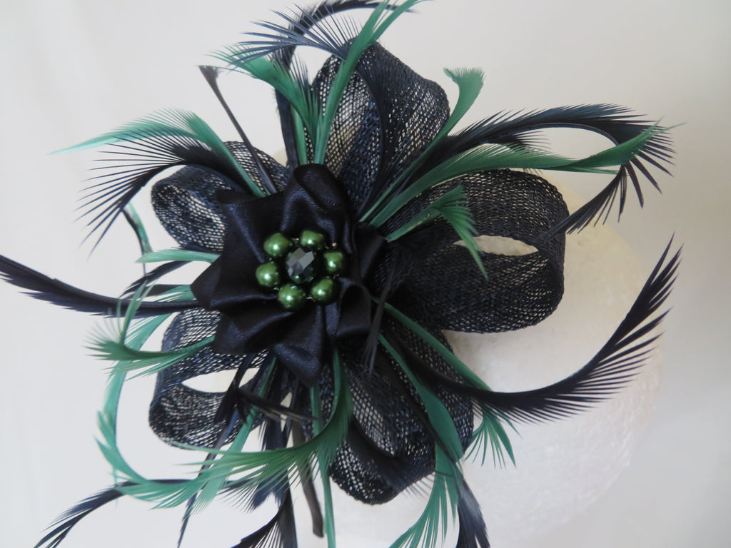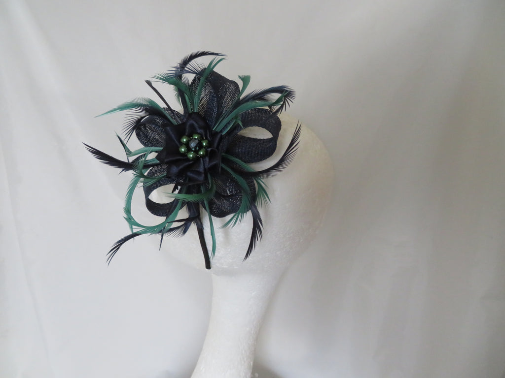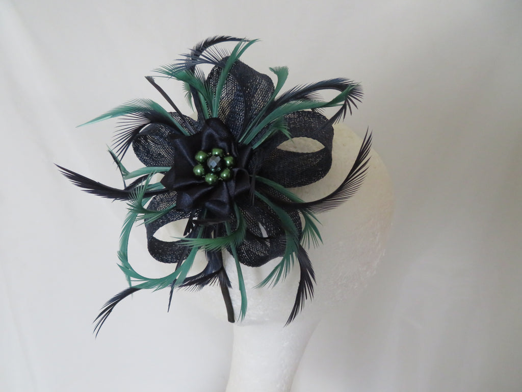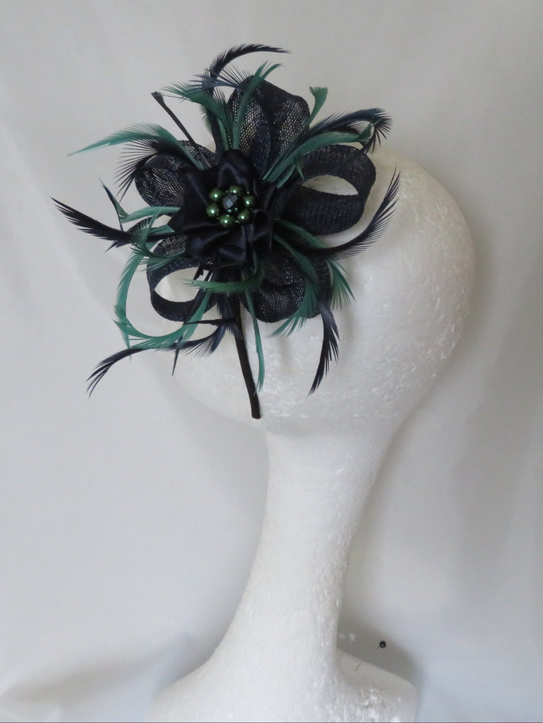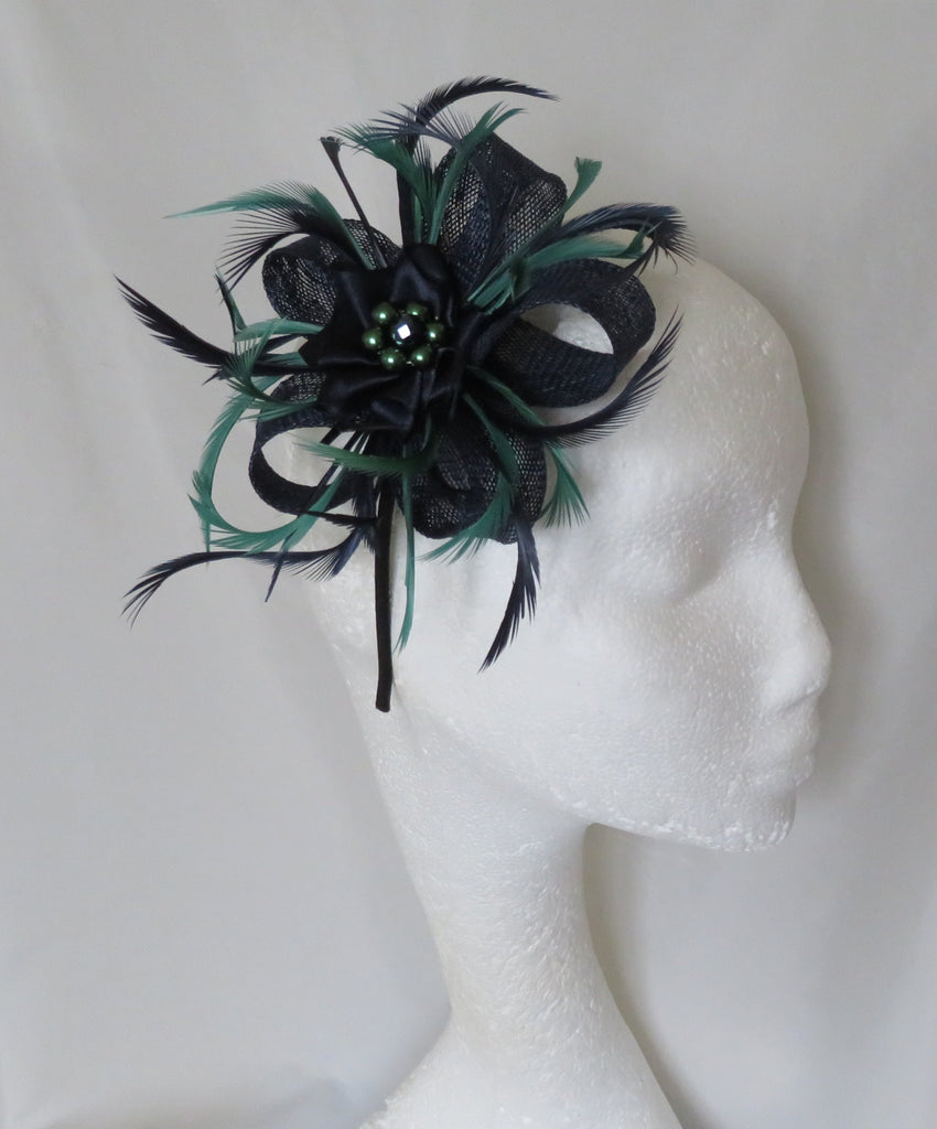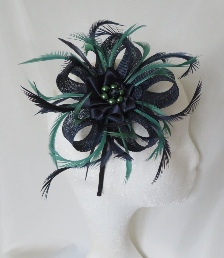 Complemented with dark navy and light bottle green biot feathers and finished with a dark navy blue satin ribbon ruffle, and a cluster of dark green pearls and a navy blue crystal in the centre.