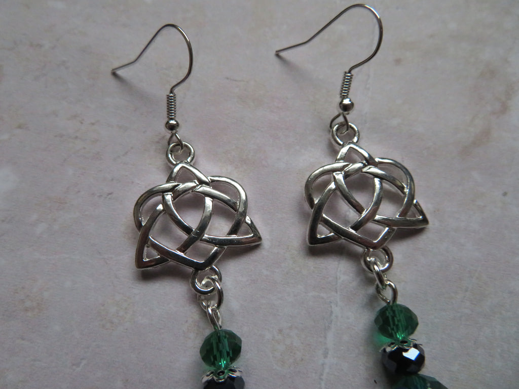 A beautiful bright silver tone open Celtic Triquetra knot design connector with a large metallic navy rondelle glass crystal, silver flower caps and silver beads and smaller bottle green AB rainbow and navy rondelle glass crystals that all blend together to shimmer and catch the light beautifully.