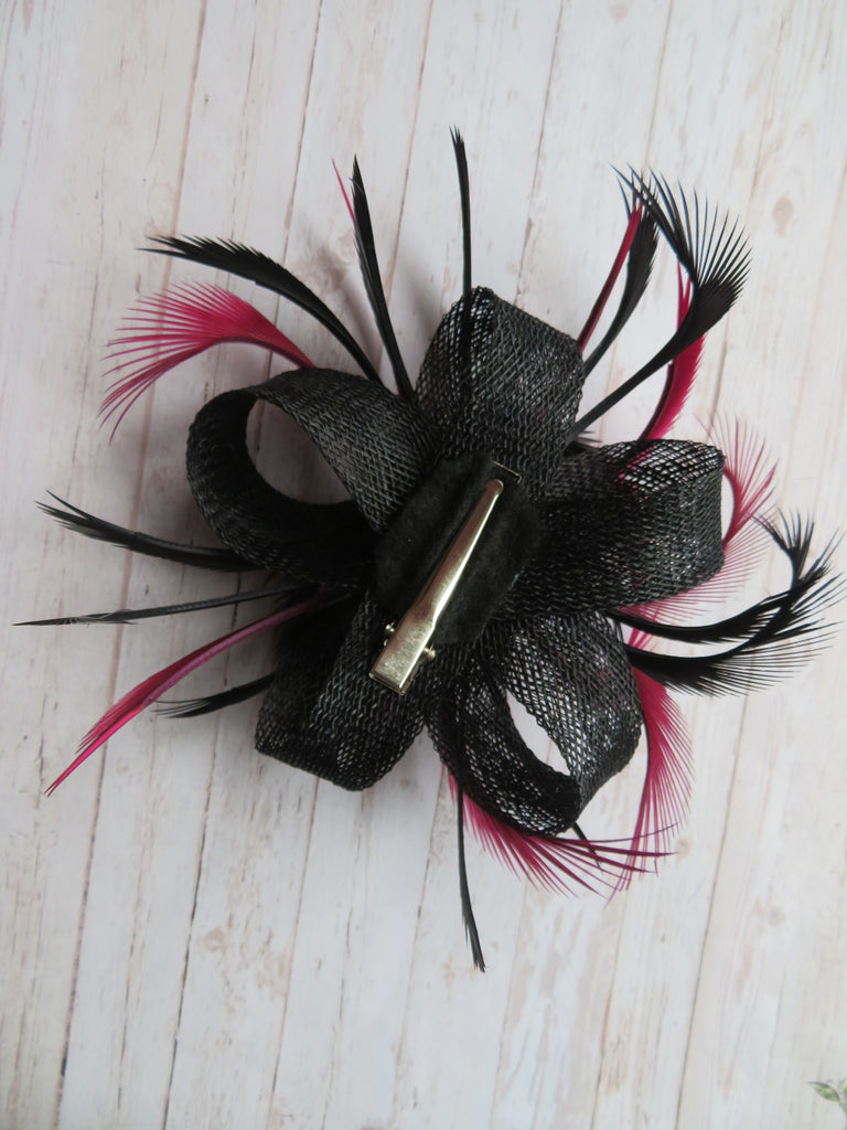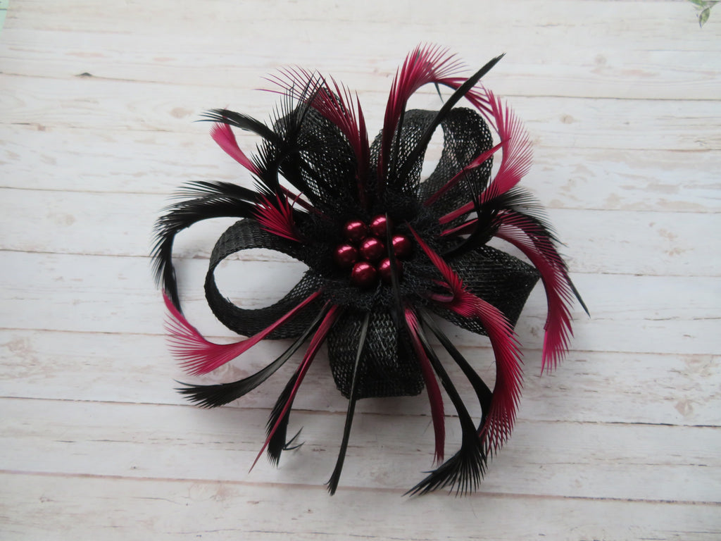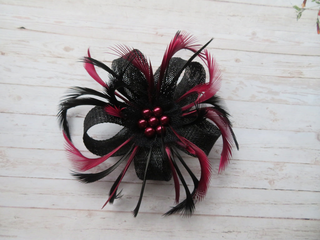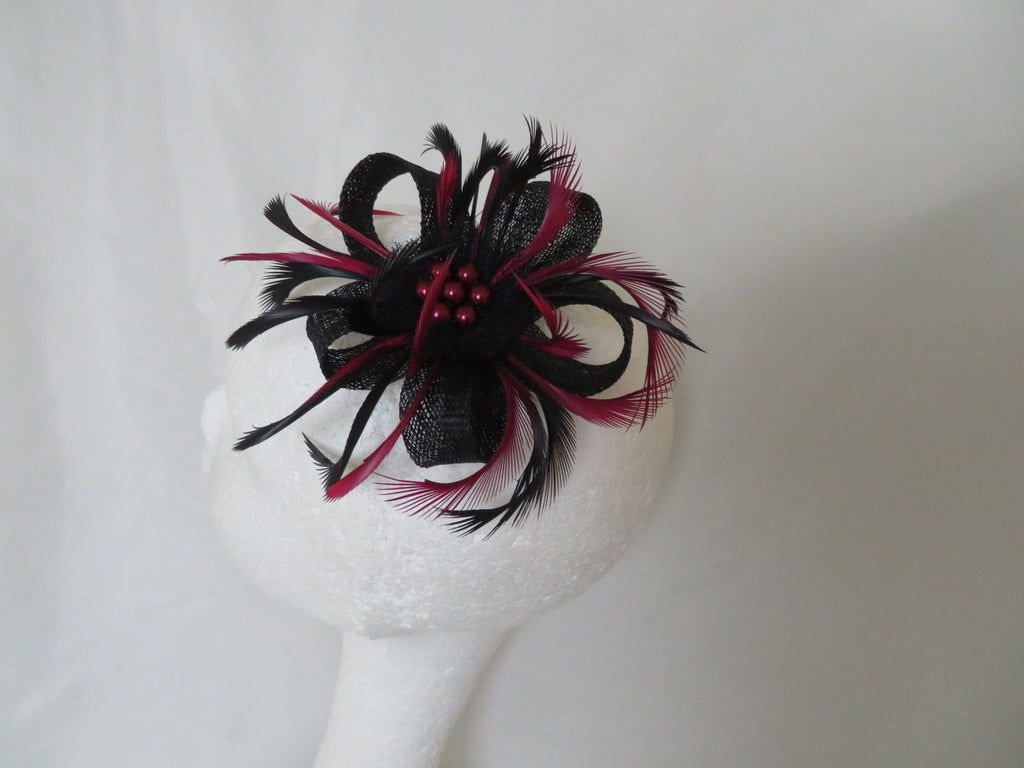 This is an attractive and eye catching sinamay loop fascinator in shades of burgundy and black.