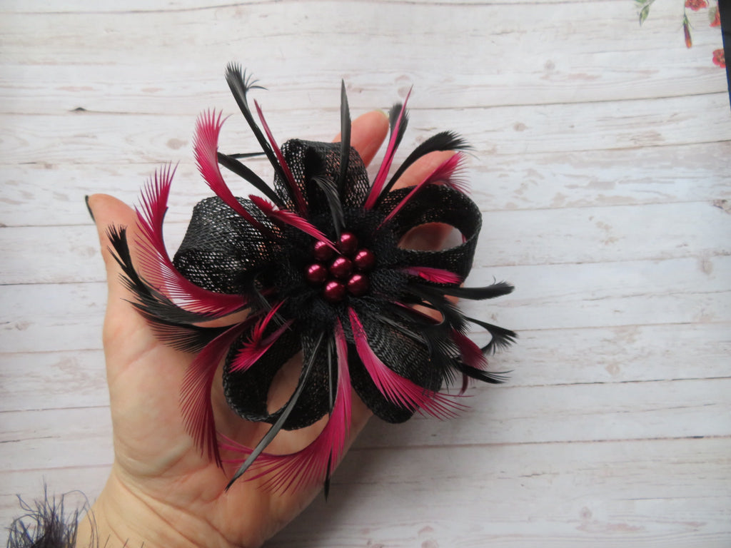 Complemented with burgundy and black biot feathers and finished with a black tulle ruffle, and a cluster of burgundy pearls in the centre..