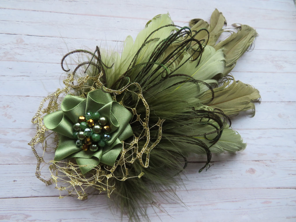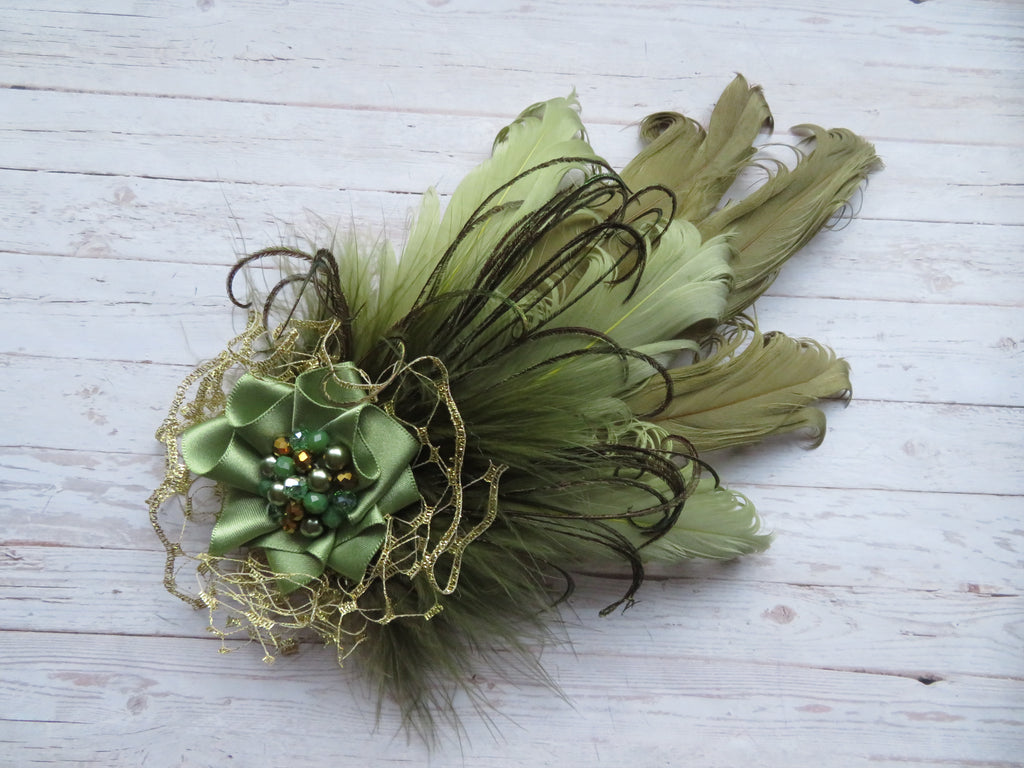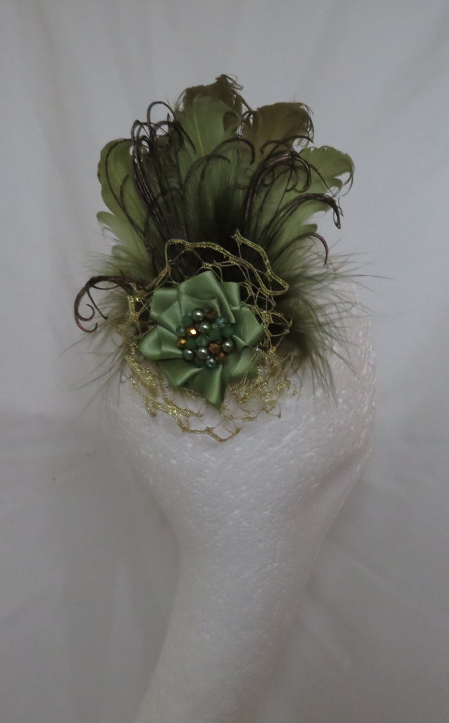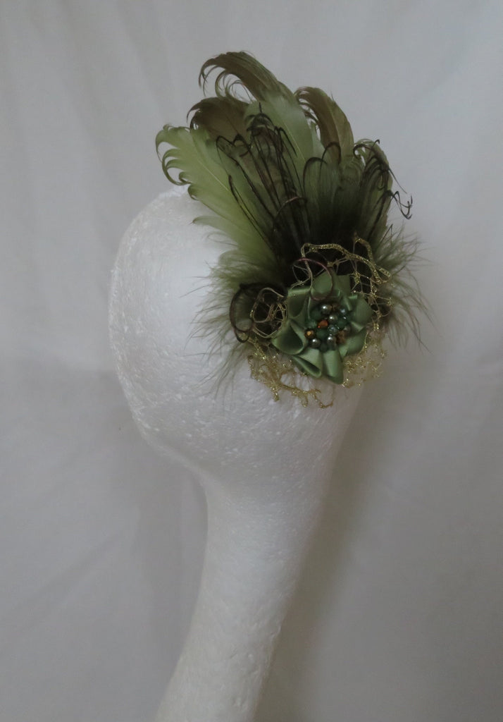 Created with olive and sage green rigid curled goose feathers with olive fluff feathers & peacock flume fronds to soften, a gold netting ruffle with a sage green satin ribbon ruffle with a cluster of pale green, sage and metallic gold crystal glass beads and pale sage pearls.