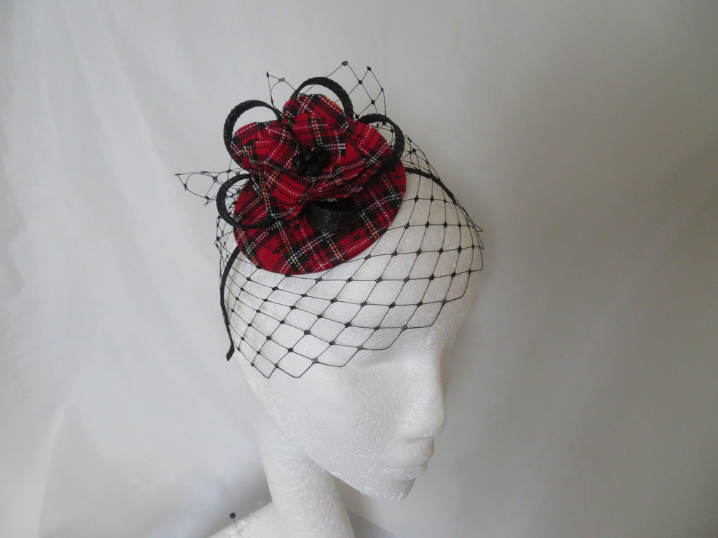 Finished with a short black merry widow veil that gently skims the forehead, black sinamay bow loops, and a hand-cut tartan flower adorned with a cluster of black crystals or pearls. A Celtic button or red pearl centre can be added upon request.