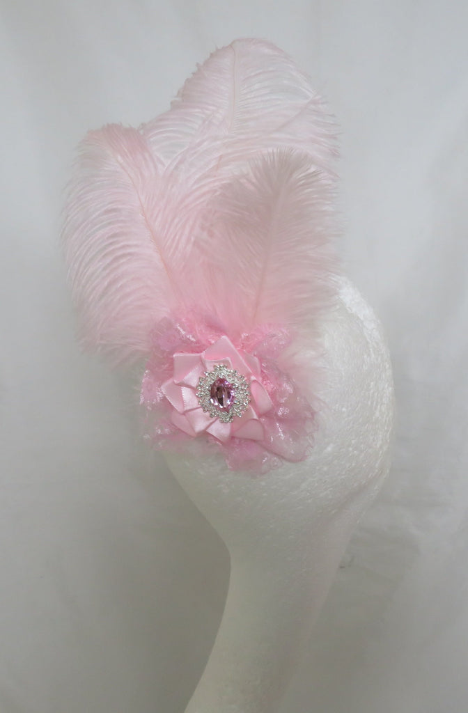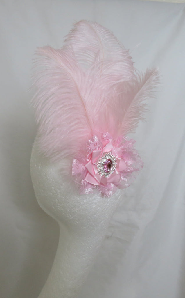 Handcrafted using three soft pale pink ostrich feathers, layered with delicate pale pink fluff feathers, the piece is accented with a gathered panel of pale pink lace.