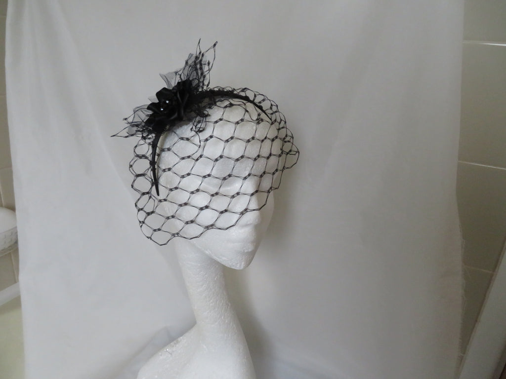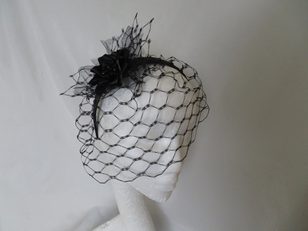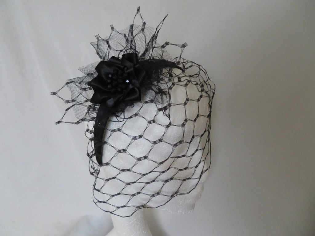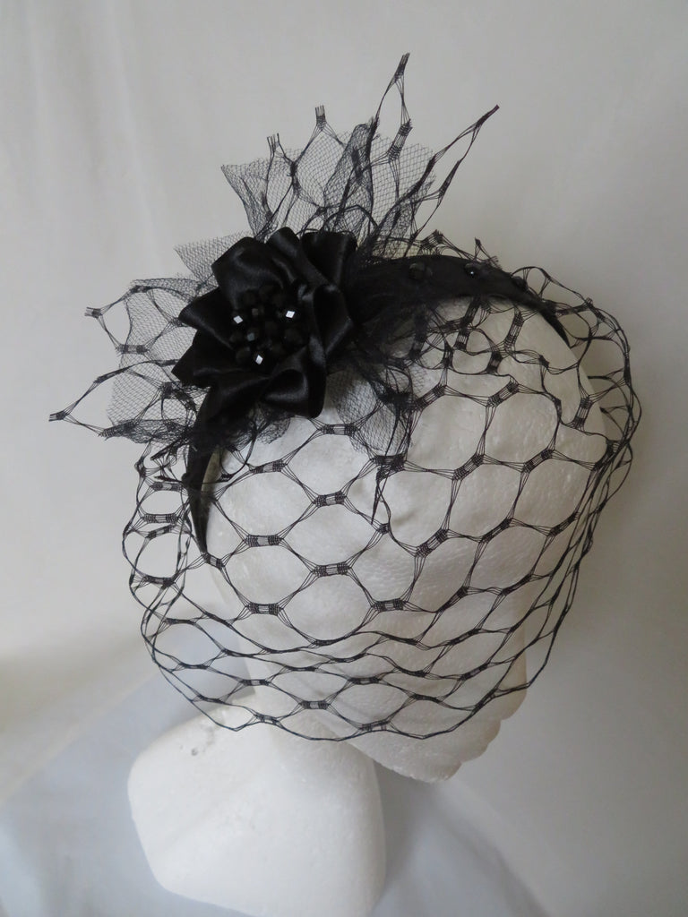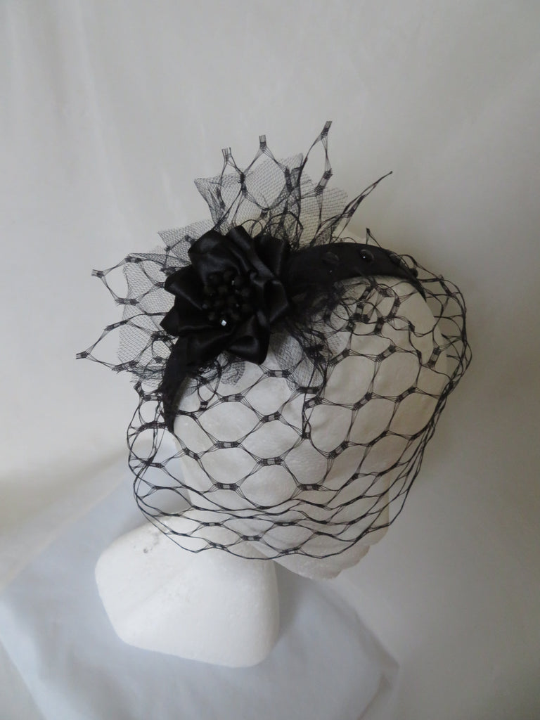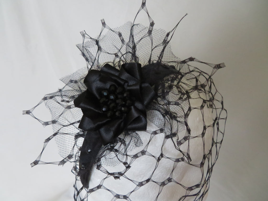This striking black veiled satin headband is a one-of-a-kind handmade piece, ready to wear for elegant occasions, gothic styling, or vintage-themed events.