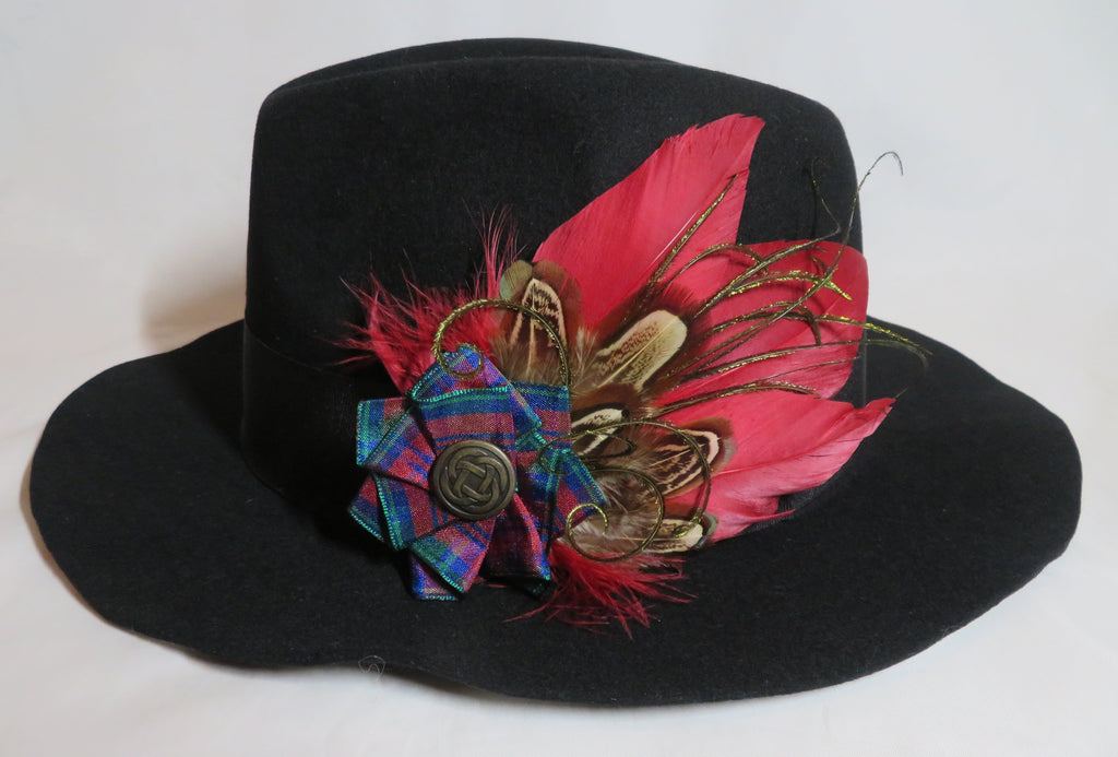 The feathers are complemented by a Lindsay tartan ribbon ruffle and finished with a classic brass Celtic button, adding a subtle nod to traditional Scottish detailing.