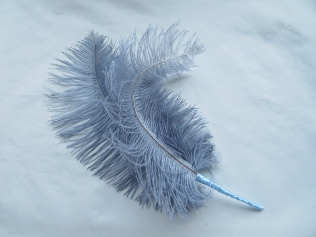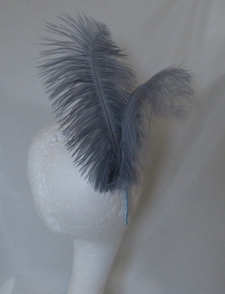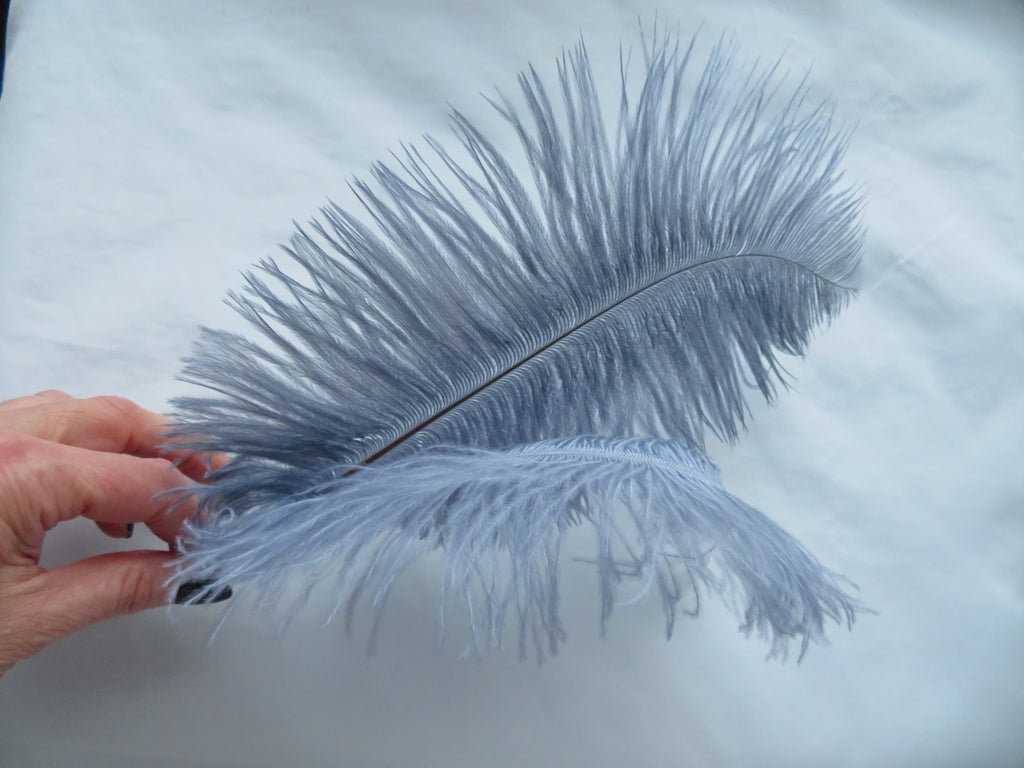 Dusty Blue/Grey - Soft 3d Curled Double Feathers - 29.5 L x 18 cm W - Stem 8cm - Pale Blue Satin