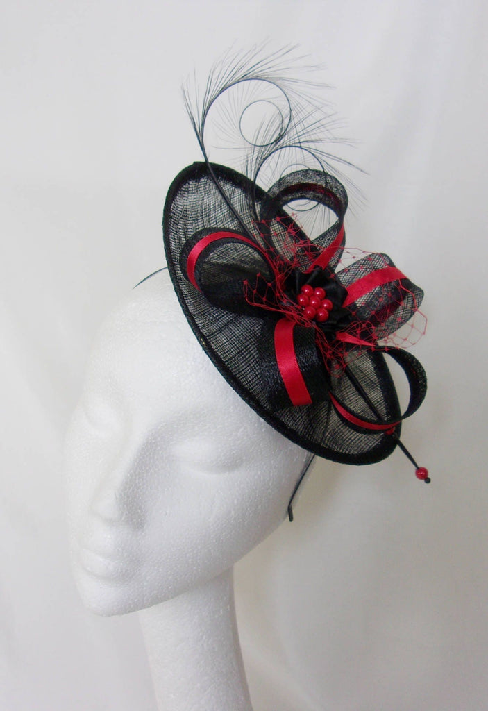This is a beautiful, simple and elegant lightweight fascinator hat in black & red.