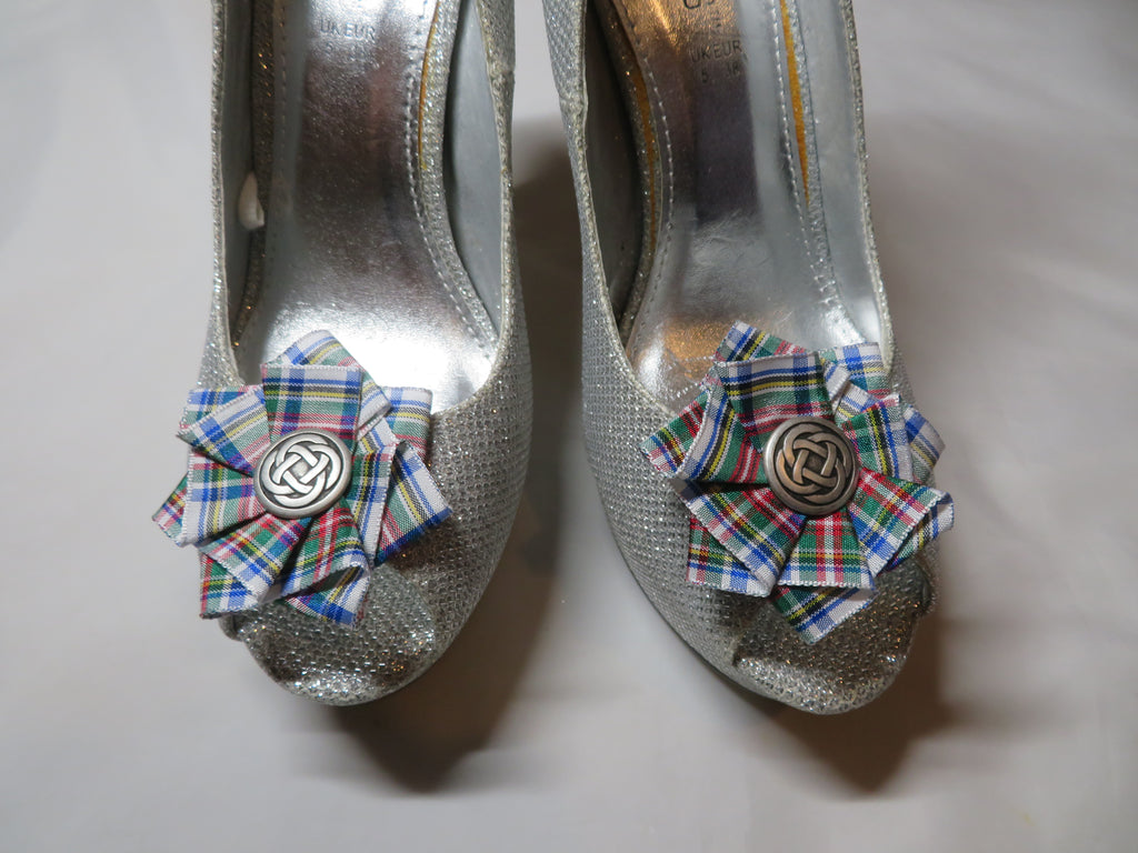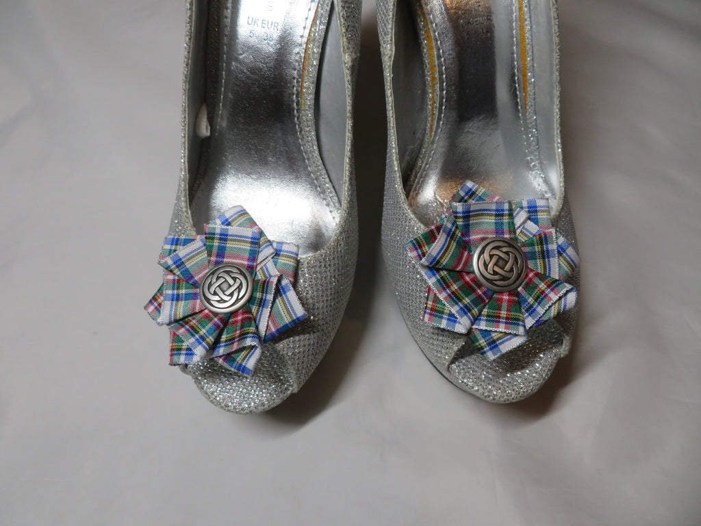 These tartan shoe clips can be worn on the front or side of your shoes and are ideal for special occasions, weddings, or Highland gatherings.