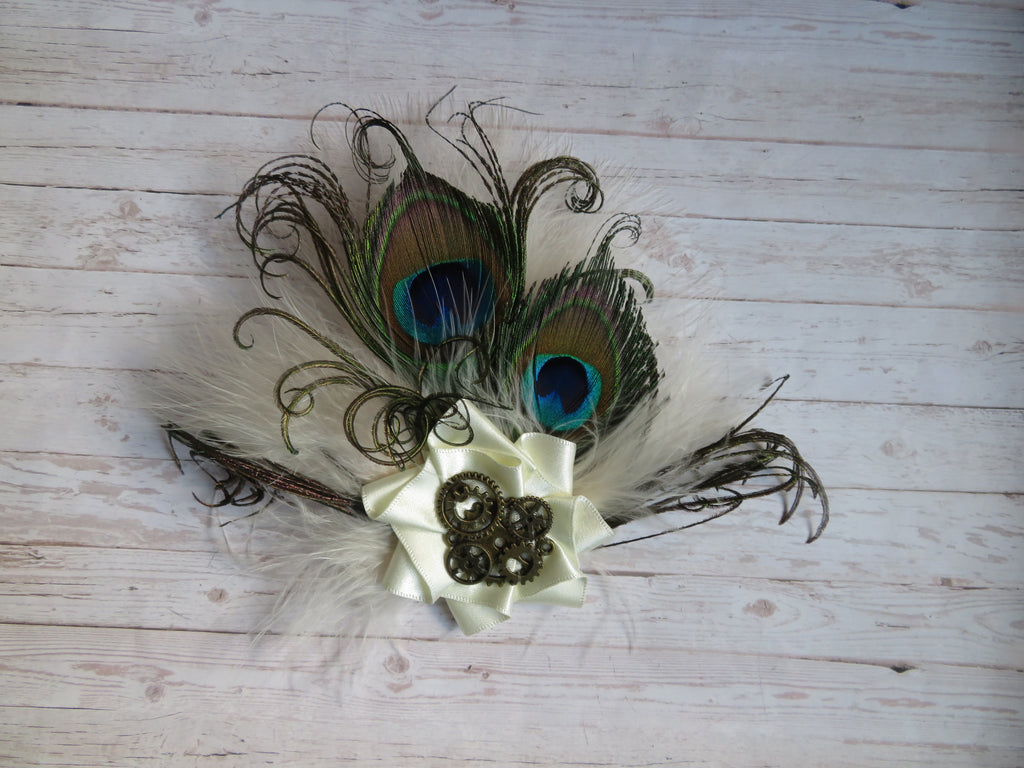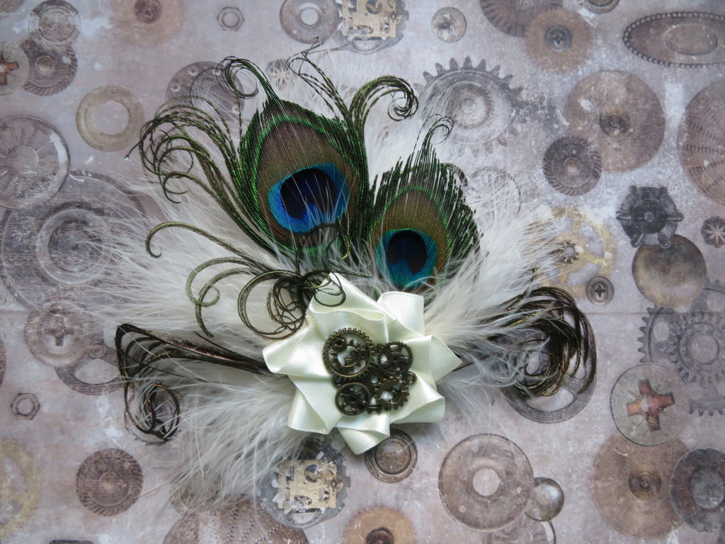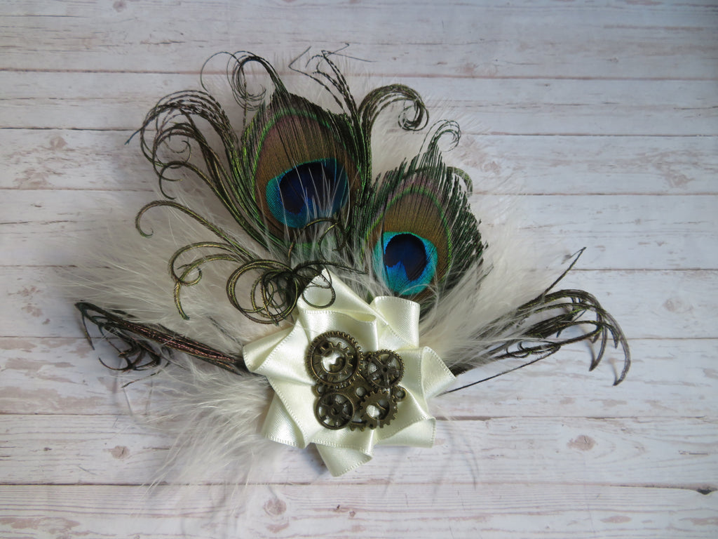 Created with a large trimmed peacock eye feather, curled peacock flume, cream ivory fluffy feathers and a small trimmed peacock eye feather.