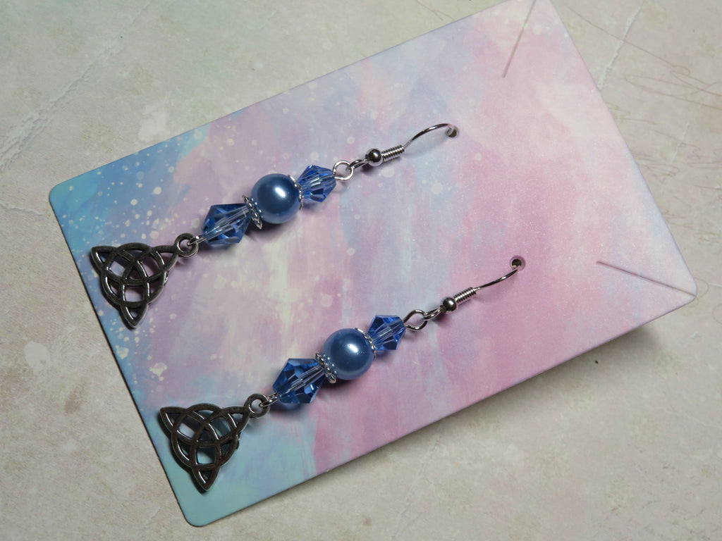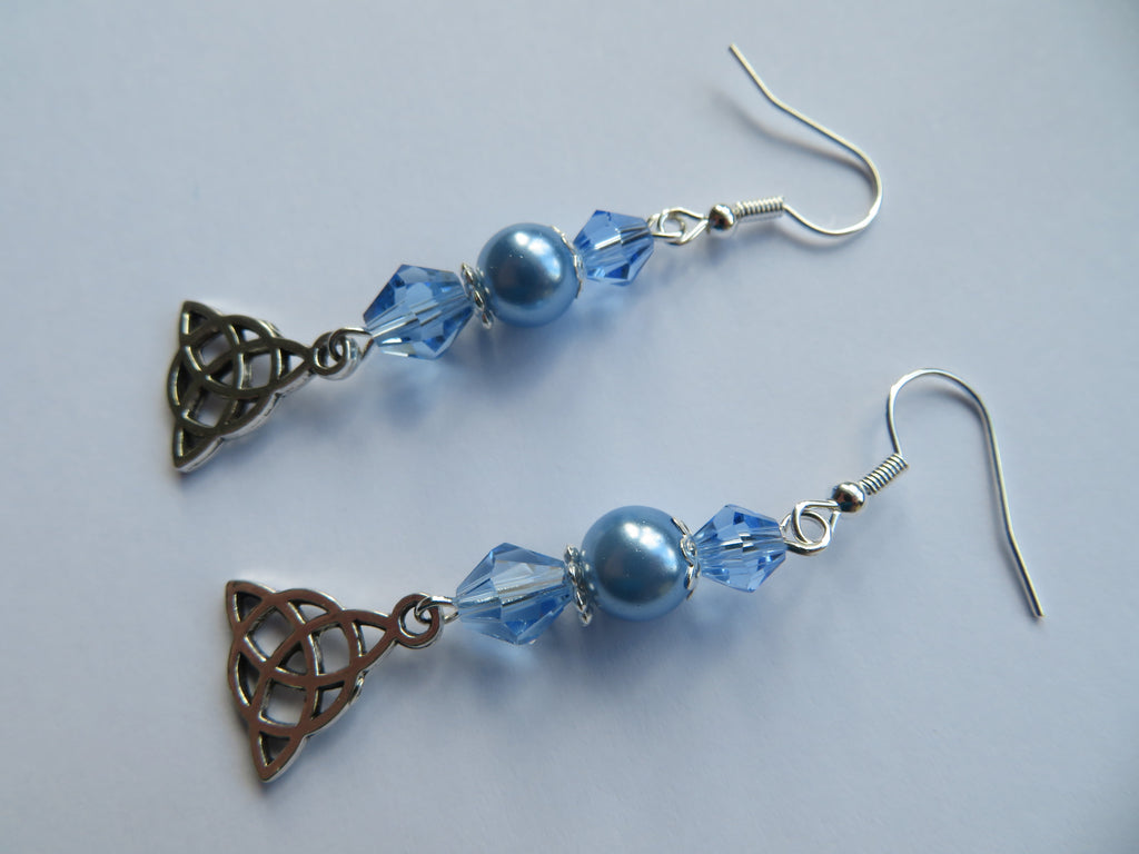 A beautiful bright silver tone open Celtic Triquetra knot design connector with hyacinth blue glass pearls, sky blue bicone glass crystals and silver filigree flower caps and spacers that all blend together to shimmer and catch the light beautifully.