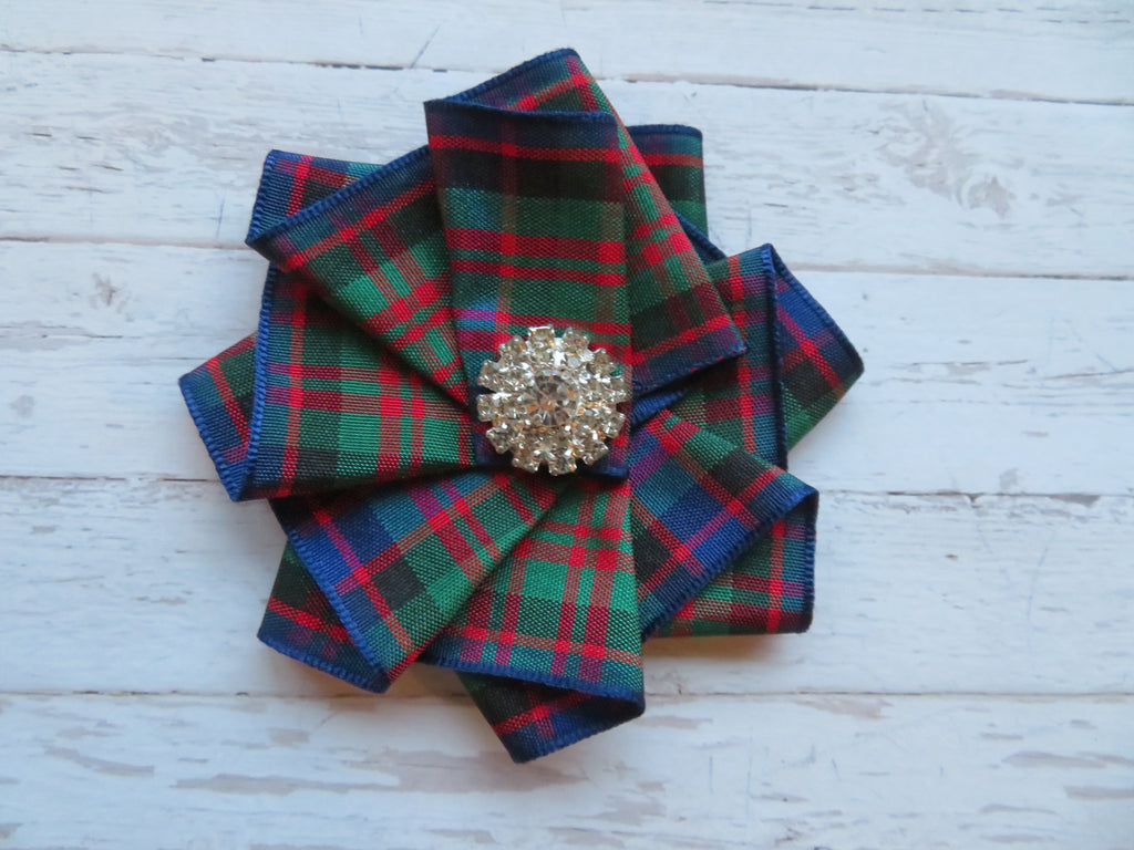 Wide Tartan Ribbon Ruffle Brooch or Hair Clip