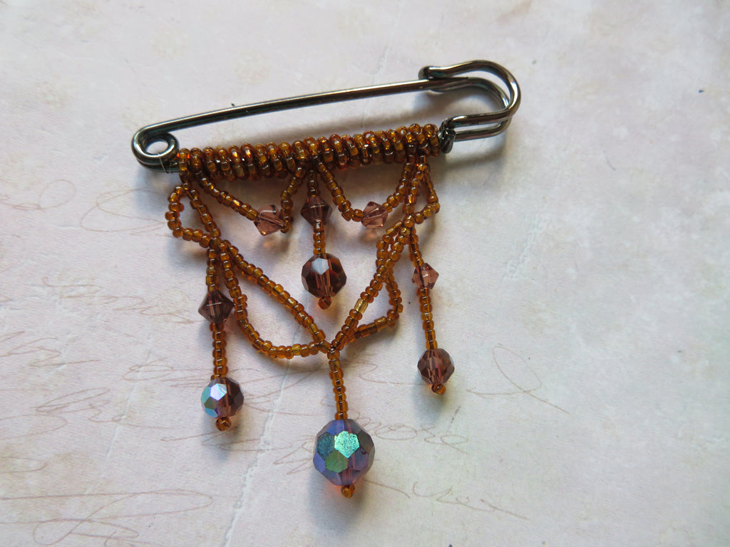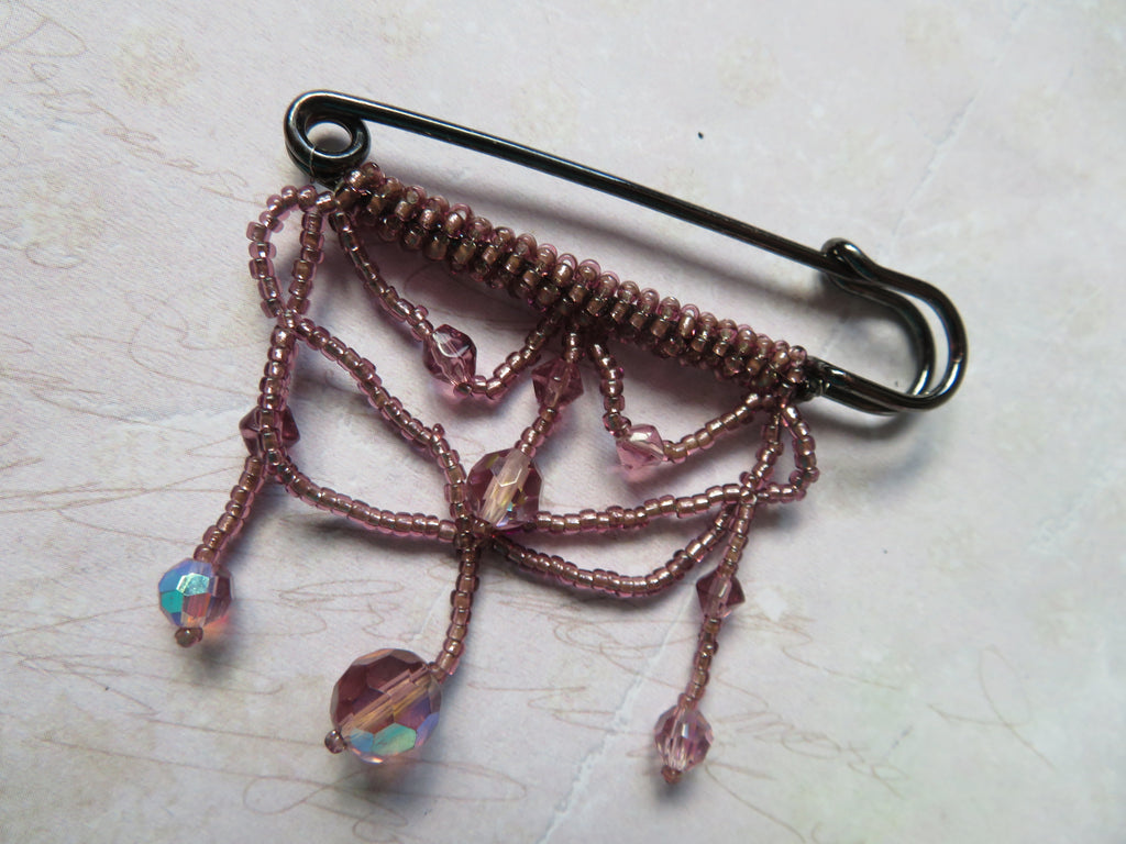 This elegant gunmetal kilt pin is adorned with delicate seed bead swags, finished with sparkling faceted bead drops that catch the light beautifully.