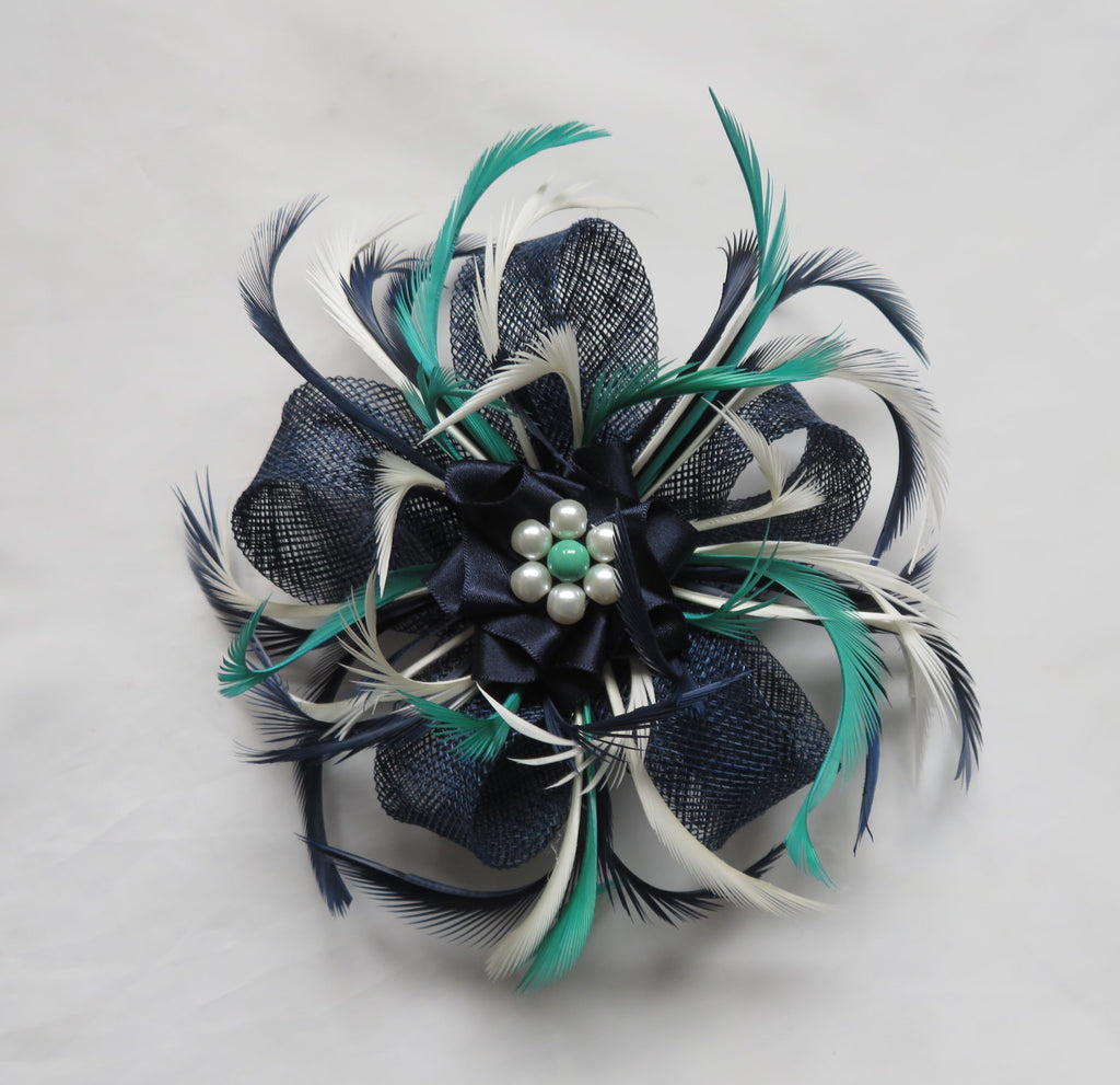 This is an attractive and eye catching sinamay loop fascinator in navy blue, ivory and jade green.